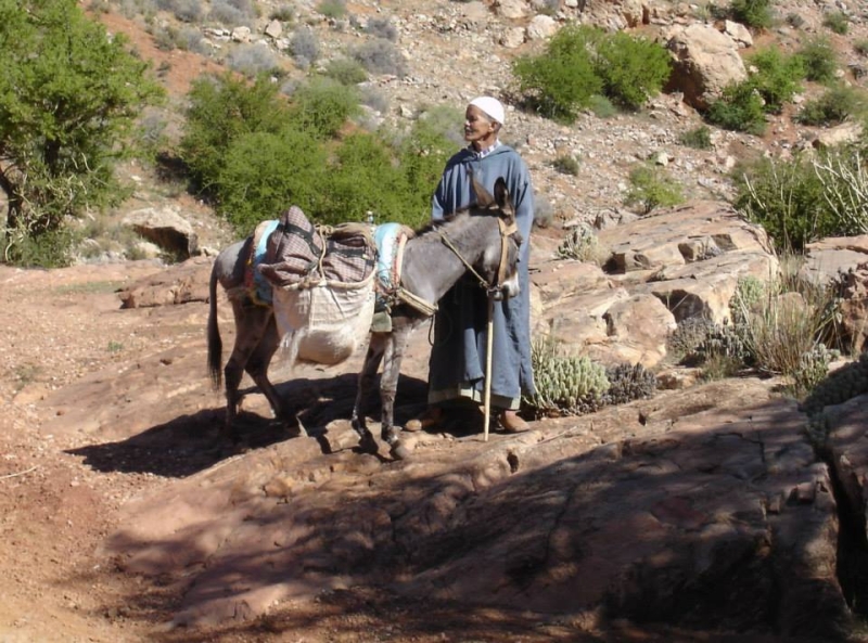 30/12: Tanite - Timoulay. Le matin, nous prenons le chemin des pèlerins vers le marabout de Sidi Brahim ou Ali. Le sentier grimpe régulièrement et la végétation se raréfie, ne laissant que quelques arganiers et thuyas. Franchissement d'un col à 1200m. Nous redescendons vers un village puis nous grimpons à nouveau vers un deuxième col à 1300m. Vaste panorama sur la vallée d'Ankelout. Ensuite nous redescendons vers l’oasis de Tizgui. L'après-midi, notre chemin continue à travers les plantations d’amandiers et les champs jusqu’au village de Timoulay. Nuit à l'hôtel.