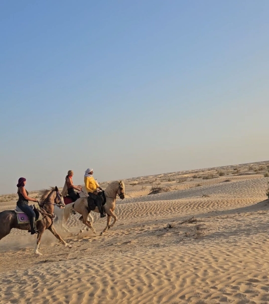 Cette rando à cheval en Tunisie offre aux cavaliers une occasion unique d'explorer les paysages vastes et fascinants du Sahara tunisien. Cette randonnée équestre en Tunisie est conçue pour ceux qui ont soif d'aventure et apprécient la beauté des grands espaces. Ce voyage à cheval emmène les cavaliers au cœur du désert, où des dunes dorées sans fin s'étendent à perte de vue, créant une atmosphère sereine et impressionnante. Accompagné de guides locaux expérimentés, vous parcourez des terrains divers: des dunes de sable vallonnées aux plateaux rocheux, et découvrez les joyaux cachés du désert, tels que les oasis isolées et les villages bédouins traditionnels. Cette aventure immersive n'est pas seulement un voyage physique mais aussi culturel, offrant un aperçu du riche patrimoine de la Tunisie et de la vie quotidienne de ses habitants. La rando comprend des nuits passées sous le ciel étoilé du désert dans des bivouacs confortables, où les cavaliers peuvent se détendre autour d'un feu de camp, partager des histoires et déguster des repas traditionnels préparés par l'équipe locale. Chaque jour apporte une nouvelle perspective sur la beauté du désert: qu'il s'agisse d'un lever de soleil à couper le souffle, du rythme tranquille de la traversée des dunes ou des couleurs vibrantes du soleil couchant.