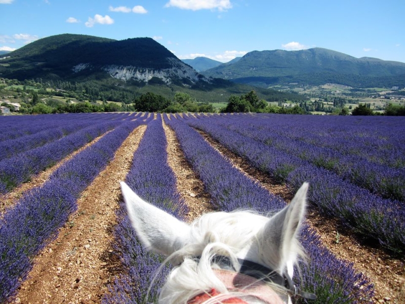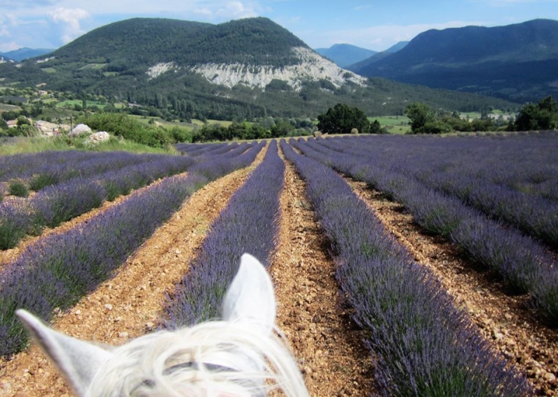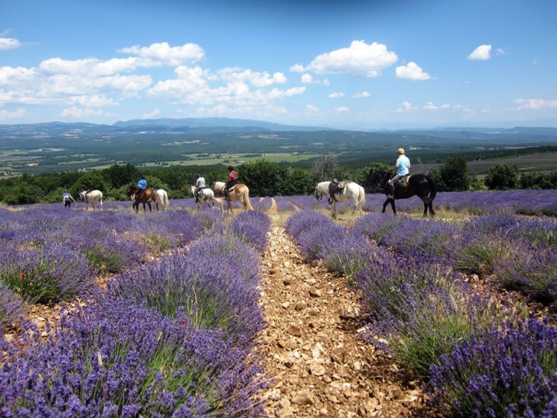Jour 11 - Mercredi: Rustrel – Revest-du-Bion. Nous repartons à cheval vers le Plateau d'Albion, en quittant le Parc Naturel du Luberon et entrant dans le Parc Naturel du Ventoux. Nous montons tranquillement dans une "combe", vallon ombragé par les chênes verts, jusque sur le Plateau, haut lieu de la culture de la lavande. Pique-nique près d'une chapelle avant de parcourir le plateau, ancien site de lancement de missiles nucléaires sol-sol balistiques de la Force de dissuasion nucléaire française de 1971 à 1996. Chevauchée parmi les champs de lavande et de sauge. Arrivée au gîte où vous pourrez vous détendre dans la piscine ou aller visiter le village de Sault, capitale de la lavande, faire un peu de shopping, prendre l'apéritif sur une terrasse de café du village.