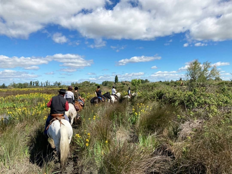 Vendredi: Matinée libre pour visiter le village classé de Lourmarin et profiter de son superbe marché hebdomadaire. Déjeuner libre (non compris) dans un restaurant du village. A 13 heures: transfert en minus pour la Camargue ou avec votre voiture. Accueil et installation au Mas à 14h au coeur de la Camargue. Départ vers 14h30 pour une promenade à cheval de deux heures en monte traditionnelle camargue, durant laquelle vous pourrez découvrir la richesse de l’intérieur des terres du Parc Naturel Régional de Camargue. Soirée libre. Diner libre (non compris) aux Saintes Maries de la Mer ou dans un restaurant à 5mn du mas. Si vous n'avez pas de véhicule, transfert en taxi (50 € par voiture aller-retour) aux Saintes Maries de la Mer. Retour au mas, nuit au mas.